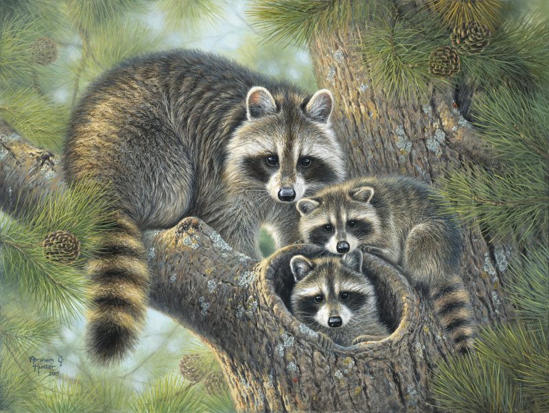 Early this spring, my brother and his wife stumbled upon two baby orphaned raccoons. I quickly volunteered to assume the role of daddy (and mother) so as to take good care of them. They were barely two weeks old and kept me up every two hours to feed them from a bottle and cuddle them. My sister gave them their names; these masked bandits deserved, Bonnie and Clyde. They were the sweetest pets I've ever had, and kept me company for weeks in my studio. They're now living happily with other raccoons on a wildlife refuge and even though I'm sure they don't remember me, I will always remember the precious moments I spent with them. I took painstaking time on their portraits, and I tried to capture their individual personalities. Clyde had bigger, floppy ears and always had a cute bewildered look on his face while he followed his big sister around. Bonnie was extremely curious, very vocal, and was a big mischief maker to say the least. These paintings of them hold a very special place in my heart, and I'm so glad you've given me the chance to share these paintings of my kids with you.
