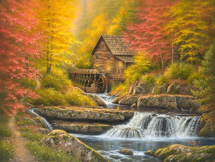 The very first time I visited the Smoky Mountains, I saw an old mill that had been turned into a restaurant, complete with the water wheel still turning. That evening as the afternoon clouds broke, the vibrant colors of the sunset cast a beautiful golden light all across the countryside. The next day, I took photos and made preliminary sketches on site, while taking careful notice of all the tiny details such as how the Pigeon River looked as it flowed through the town, what kinds of plants grew in the national park, how the trees looked as they grew amid the big rocks in the mountains, how the lichens and moss collected on the boulders, and what critters had made this amazing land their home. Remember When is the result of all that research, and it captures the beauty I was overcome with when I first came to the mountains years ago. This rustic old mill is not the same mill I saw during that first visit to the Smoky Mountains, this one is located in West Virginia. The setting reminds me off the beauty of nature, but the mill reminds me of the settlers who tamed this wilderness and used this mill to grind corn and flour for food. I hope this Old Mill blesses you and perhaps brings back some memories for you. As you think of those early settlers, and the hardships they endured just to get simple pleasures, try to Remember When.